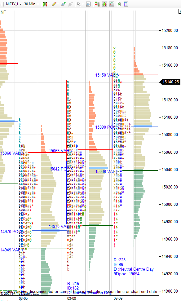 Third day of overlap profile with two way auction.Buyers emerged as winners with neutral day closing at dVAH..They need to defend 15120-15100 all day tomorrow to sustain higher.